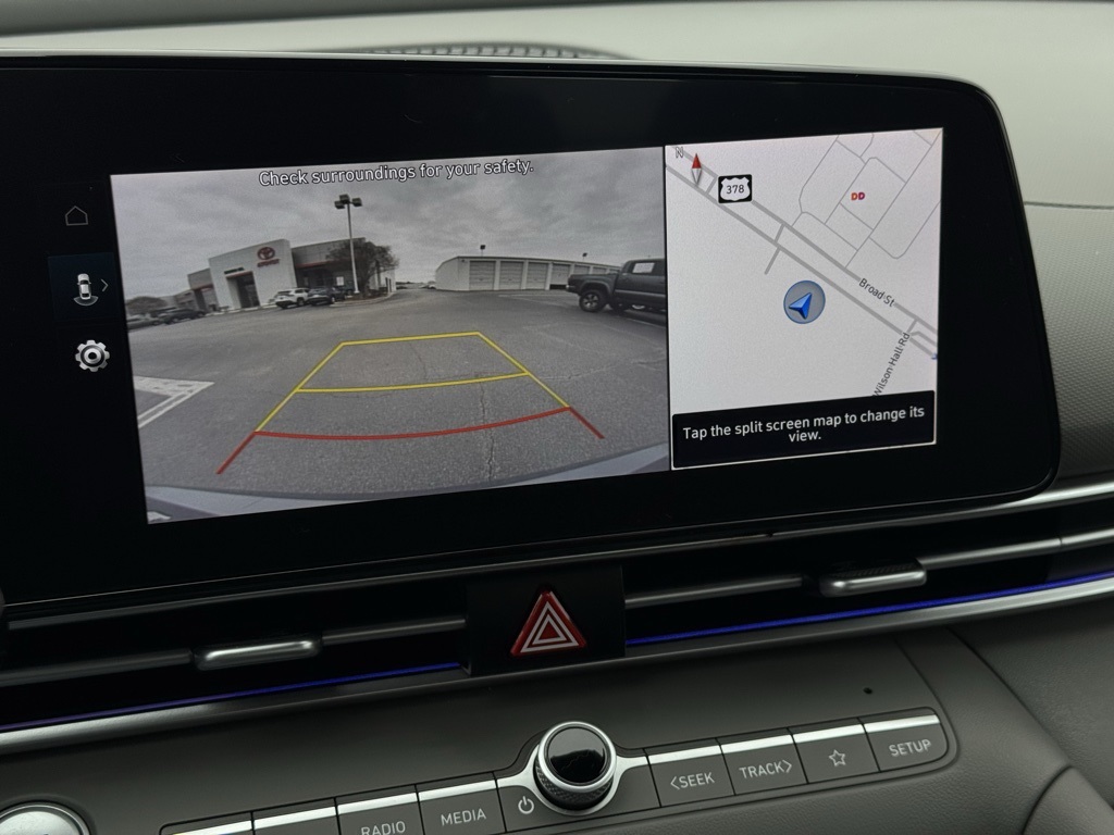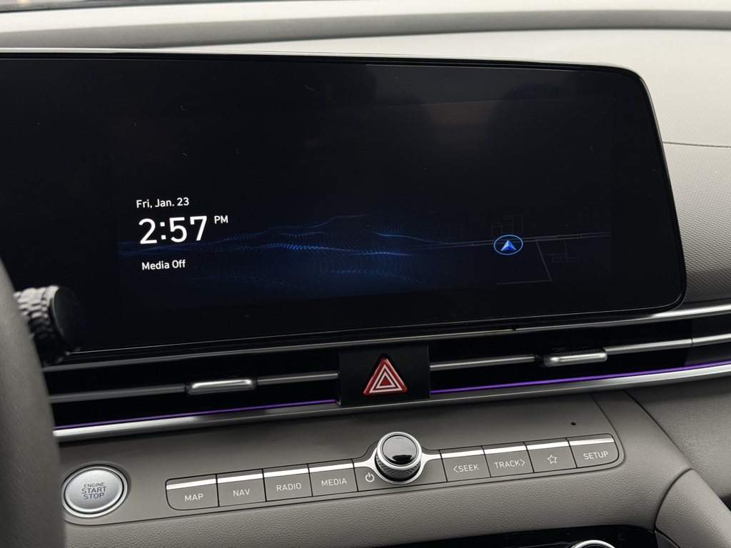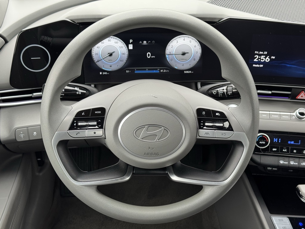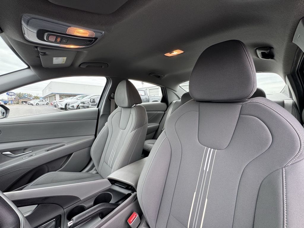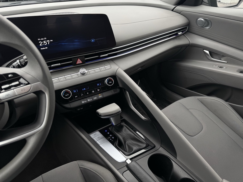 - 16" x 6.5J Alloy Wheels, 4-Wheel Disc Brakes, 6 Speakers, ABS brakes, Air Conditioning, Alloy wheels, AM/FM radio: SiriusXM, Apple CarPlay & Android Auto, Auto High-beam Headlights, Automatic temperature control, Brake assist, Bumpers: body-color, Cloth Seat Trim, Delay-off headlights, Driver door bin, Driver vanity mirror, Dual front impact airbags, Dual front side impact airbags, Electronic Stability Control, Emergency communication system: Bluelink+, Exterior Parking Camera Rear, Front anti-roll bar, Front Bucket Seats, Front Center Armrest, Front dual zone A/C, Front reading lights, Front wheel independent suspension, Fully automatic headlights, Illuminated entry, Low tire pressure warning, Navigation System, Occupant sensing airbag, Option Group 01, Outside temperature display, Overhead airbag, Overhead console, Panic alarm, Passenger door bin, Passenger vanity mirror, Power door mirrors, Power steering, Power windows, Radio: AM/FM/HD/SiriusXM Display Audio, Rear side impact airbag, Rear window defroster, Remote keyless entry, Security system, Speed control, Speed-sensing steering, Steering wheel mounted audio controls, Tachometer, Telescoping steering wheel, Tilt steering wheel, Traction control, Trip computer, Variably intermittent wipers.2024 Hyundai Elantra SEL