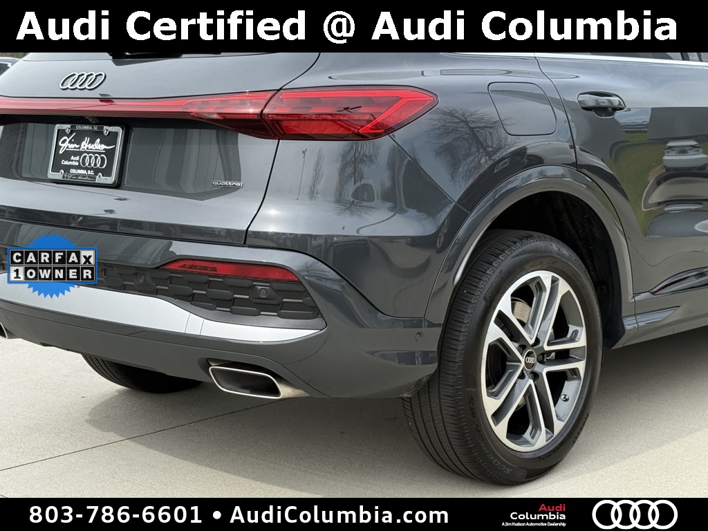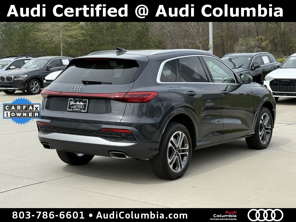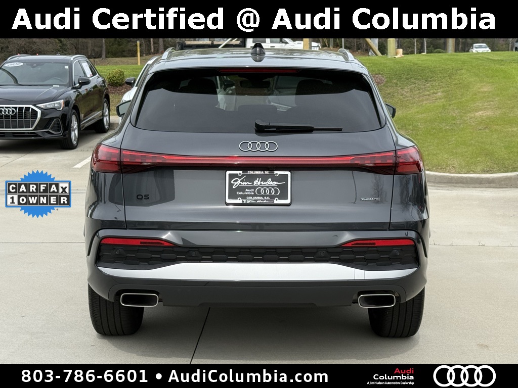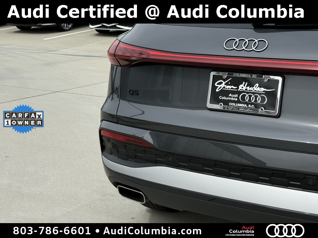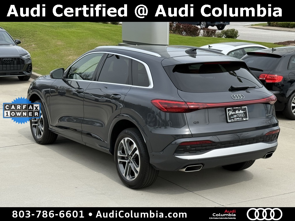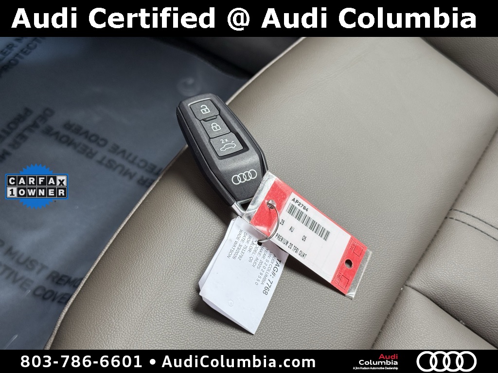 - Audi Certified pre-owned Details: * 125+ Point Inspection * Vehicle History * Warranty Deductible: $0 * Certified pre-owned Limited Warranty: For all CPO sales on or after 8/1/23, if New Vehicle Limited Warranty (NVLW) coverage remains at time of CPO purchase, CPO Limited Warranty Coverage commences upon expiration of NVLW and continues for a period of 1 year or 20,000 miles, whichever occurs first. If NVLW coverage has expired at time of CPO purchase, CPO Limited Warranty coverage commences at time of purchase and continues for 1 year or 20,000 miles, whichever occurs first. Roadside Assistance for 1 year with unlimited miles, whichever occurs first. Effective 8/1/23 onward, private party transfers no longer accepted, eligible for previous CPO customers with sale dates prior to 8/1/23 to utilize if they so choose. * Roadside AssistanceClean CARFAX. CARFAX One-Owner.2025 Audi Q5 2.0T Premium Clean CarFax, One Owner, Well Maintained, 10 Speakers, 19" Wheel Package, 4-Wheel Disc Brakes, ABS brakes, Alloy wheels, Auto High-beam Headlights, Auto-dimming Rear-View mirror, Convenience Package, Dual front impact airbags, Dual front side impact airbags, Electronic Stability Control, Emergency communication system: Audi connect CARE, Exterior Parking Camera Rear, Front anti-roll bar, Front dual zone A/C, Garage door transmitter: HomeLink, Heated door mirrors, Heated Front Bucket Seats, Heated Steering Wheel, Illuminated entry, Leather Seating Surfaces, Low tire pressure warning, Memory seat, Navigation System, Occupant sensing airbag, Overhead airbag, Power Liftgate, Radio: MMI Navigation Plus, Rain sensing wipers, Rear anti-roll bar, Remote keyless entry, Speed-sensing steering, Speed-Sensitive Wipers, Steering wheel mounted audio controls, Top View Camera System, Traction control, Wheels: 19" 5-Double-Spoke Design.